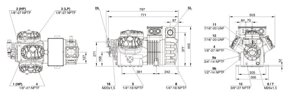- Электропитание компрессора - 3 фазы/380 В/50 Гц