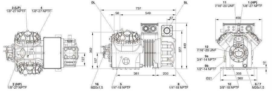 - Полугерметичное исполнение - двигатель и компрессор в одном корпусе