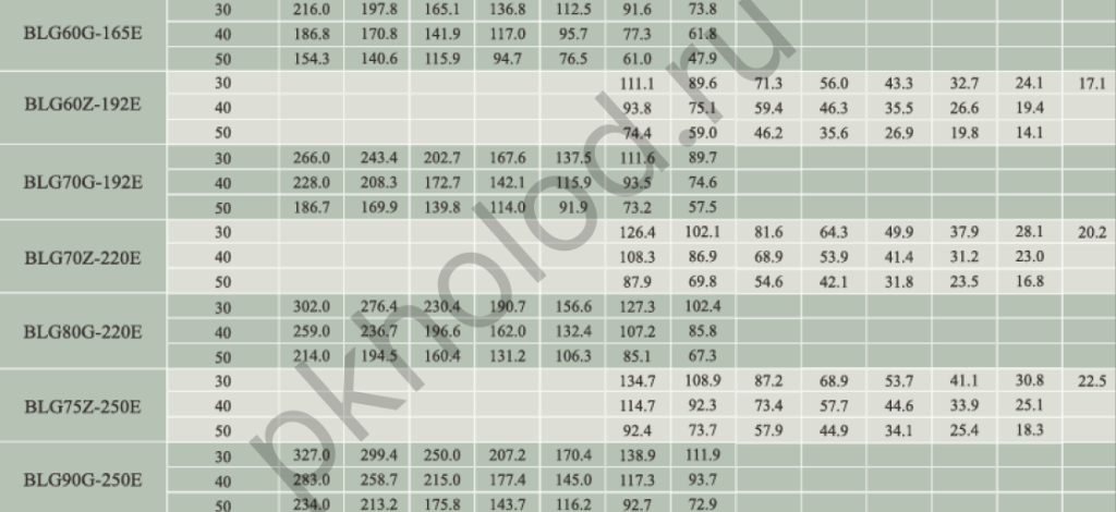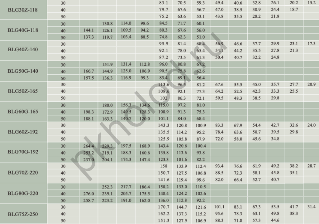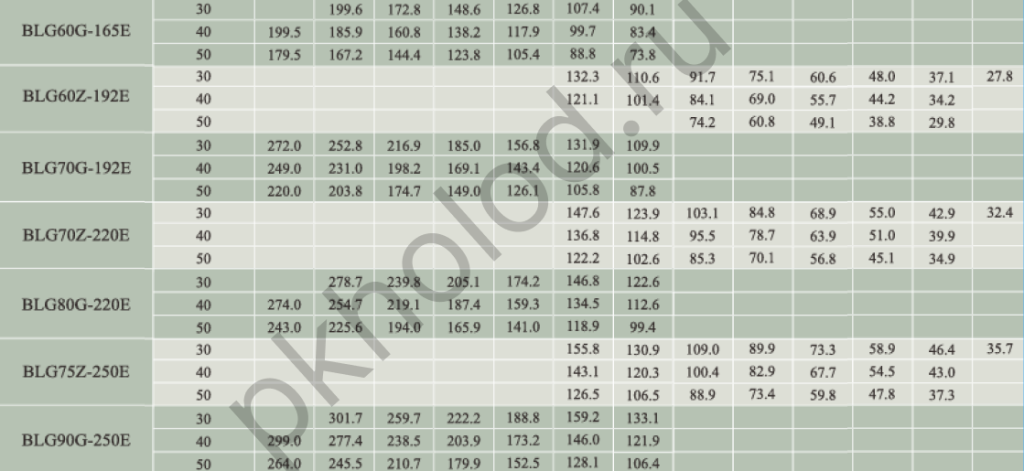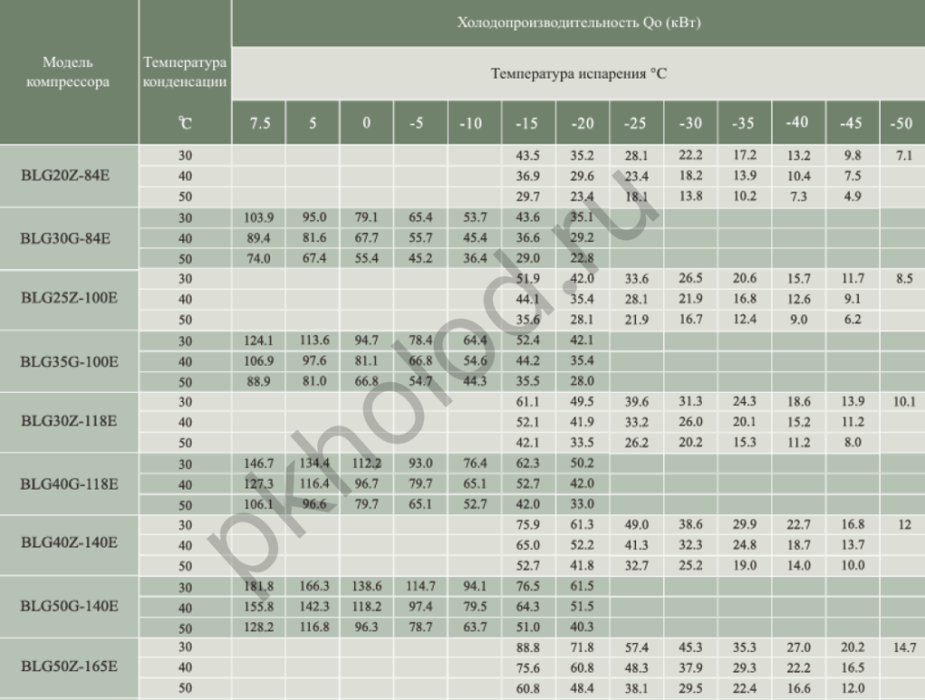Таблица холодопроизводительности при использовании R22 без экономайзера для винтовых компрессоров XUE YING BLG20Z-84, BLG30G-84, BLG25Z-100, BLG35G-100, BLG30Z-118, BLG40G-118, BLG40Z-140, BLG50G-140, BLG50Z-165, BLG60G-165, BLG60Z-192, BLG70G-192, BLG70Z-220, BLG80G-220, BLG75Z-250, BLG90G-250, BLG90Z-315, BLG110G-315, BLG110Z-359, BLG125G-359, BLG125Z-410, BLG140G-410, BLG140Z-470, BLG160Z-535, BLG180G-535