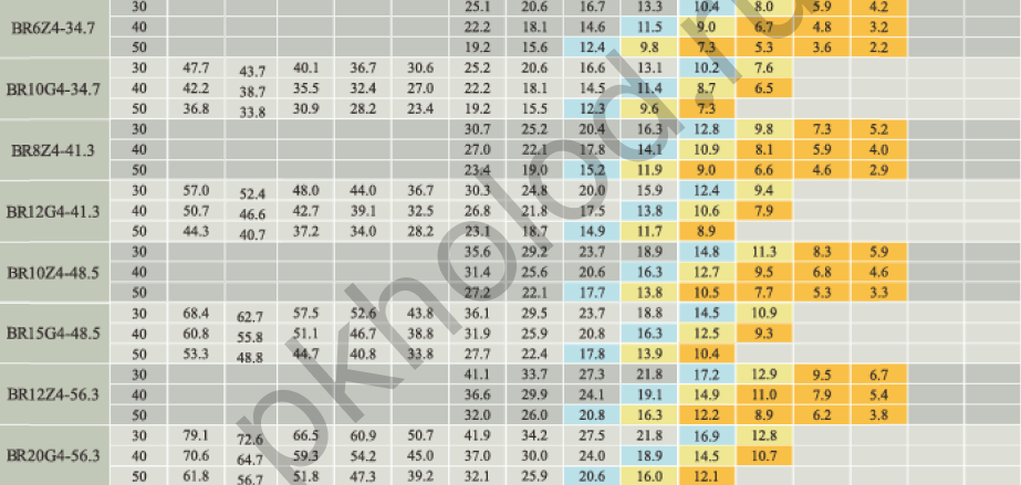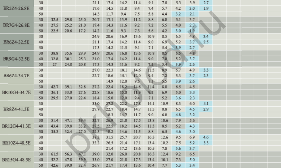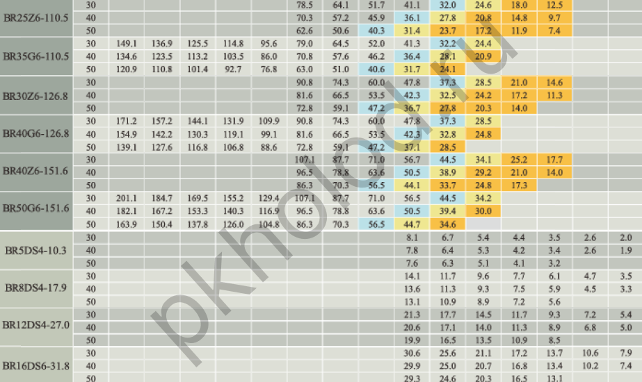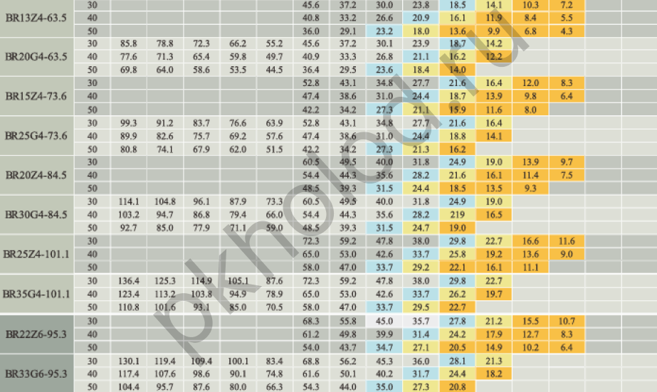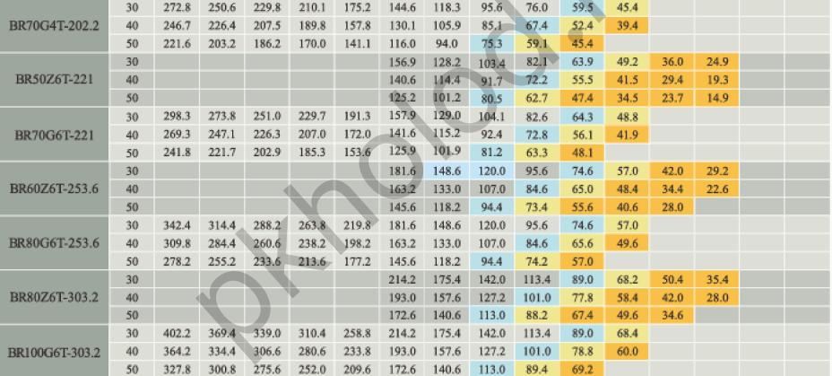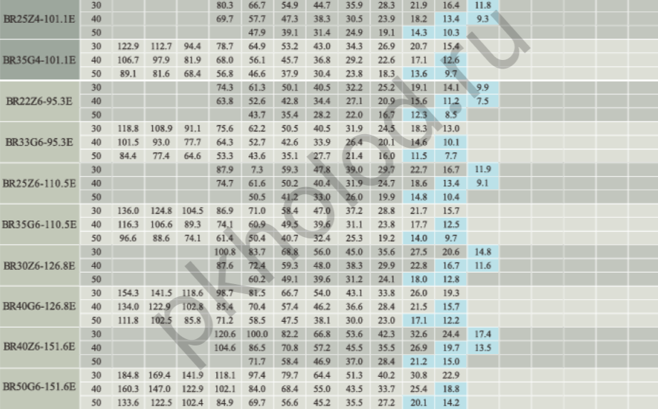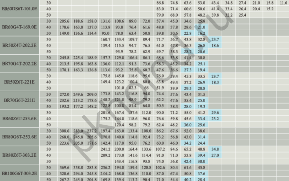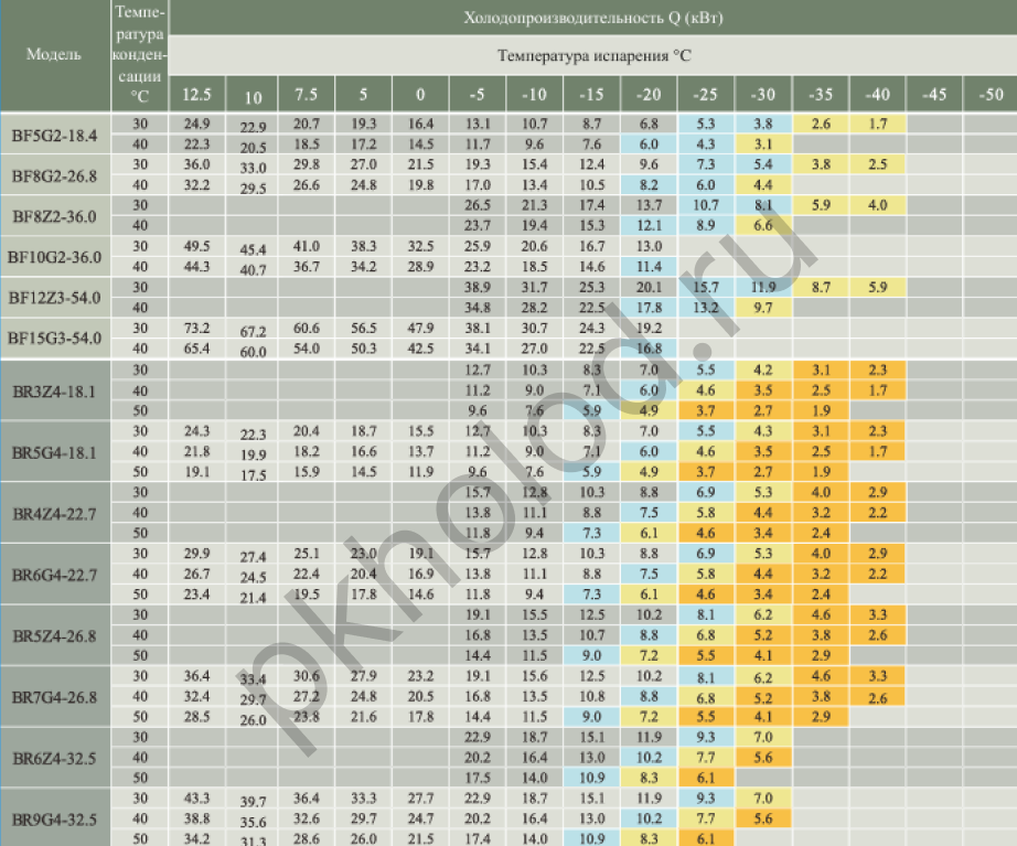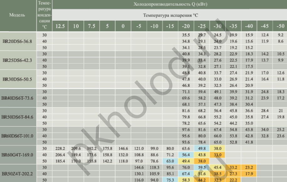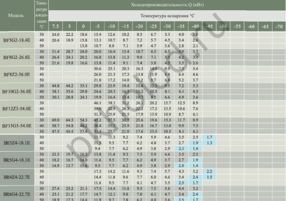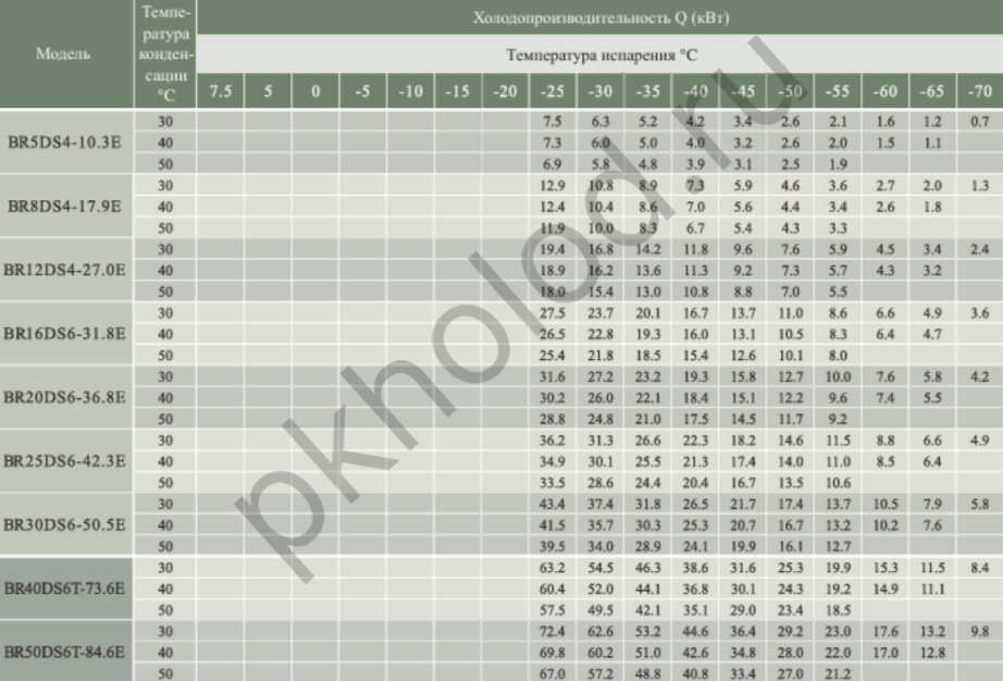 Таблица холодопроизводительности при использовании R22 для поршневых полугерметичных компрессоров XUE YING BR3Z4-18.1, BR5G4-18.1, BR4Z4-22.7, BR6G4-22.7, BR5Z4-26.8, BR7G4-26.8, BR6Z4-32.5, BR9G4-32.5, BR6Z4-34.7, BR10G4-34.7, BR8Z4-41.3, BR12G4-41.3, BR10Z4-48.5, BR15G4-48.5, BR12Z4-56.3, BR20G4-56.3, BR20G4-63.5, BR15Z4-73.6, BR25G4-73.6, BR20Z4-84.5, BR30G4-84.5, BR25Z4-101.1, BR35G4-101.1, BR25Z6-110.5, BR35G6-110.5, BR30Z6-126.8, BR40G6-126.8, BR40Z6-151.6, BR50G6-151.6, BR5DS4-10.3, BR8DS4-17.9, BR12DS4-27.0, BR16DS6-31.8, BR20DS6-36.8, BR25DS6-42.3, BR30DS6-50.5